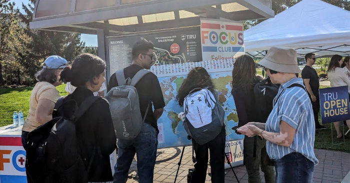 Volunteers and returning students host an ISMC booth with a huge world map. They invite passing students to label where they are from. Students are excited to find others from their home country, and, by the end of the day, the map is a colourful representation of the very international student body—who have all been invited to get to know other each other at the next ISMC event.